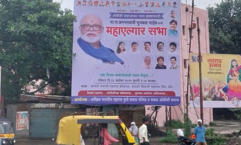 रविवार दि. 28 सप्टेंबर 2025 रोजी दुपारी 4 : 00 वाजता बीड शहरातील छत्रपती शिवाजी महाराज चौक येथील छत्रपती संभाजी महाराज क्रीडा संकुलाच्या प्रांगणात ओबीसी समाजाचे राष्ट्रीय नेते तथा कॅबिनेट मंत्री ना. छगनराव भुजबळ साहेब यांच्या प्रमुख उपस्थितीत हा महाएल्गार मेळावा होणार असून याप्रसंगी राज्याच्या पर्यावरण मंत्री ना. पंकजाताई मुंडे, माजी मंत्री आ. धनंजय मुंडे साहेब, माजी मंत्री जयदत्त अण्णा क्षीरसागर, धनगर समाजाचे नेते आमदार आ. गोपीचंद पडळकर,धनगर समाजाचे नेते मा.प्रकाश आण्णा शेंडगे. मुस्लिम समाजाचे नेते शब्बीर अन्सारी, ज्येष्ठ साहित्यिक तथा भटक्या विमुक्त समाजाचे नेते लक्ष्मणराव गायकवाड, वंजारी समाजाचे नेते सत्संग मुंडे आदींची प्रमुख उपस्थिती लाभणार आहे. ओबीसी आरक्षण अखंडित राहावे, ओबीसींच्या लेकरांना आरक्षणाचा लाभ मिळावा, ओबीसी समाजातील लेकरांच्या भवितव्यासाठी आणि ओबीसी समाजाच्या न्याय हक्काच्या मागणीसाठी सदरील महाएल्गार मेळावा होणार असून ओबीसी समाज बांधव, भगिनींनी, युवक, युवती, विद्यार्थी आणि कार्यकर्त्यांनी लाखोंच्या संख्येने उपस्थित राहावे असे आवाहन मेळाव्याचे आयोजक तथा अखिल भारतीय महात्मा फुले समता परिषदेचे प्रदेश सरचिटणीस ॲड. सुभाष राऊत यांनी केले आहे.