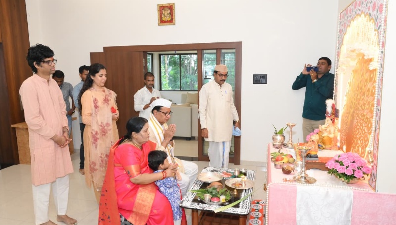 सुदर्शन निवासस्थानी श्री गणेशाची स्थापना मा महसूल व कृषीमंत्री बाळासाहेब थोरात यांच्या हस्ते झाली. यावेळी सौ कांचनताई थोरात, कन्या कॅन्सरतज्ञ डॉ जयश्रीताई थोरात, टाटा कॅन्सर हॉस्पिटलचे विभाग प्रमुख प्रा. डॉ. हसमुख जैन आदी उपस्थित होते. विधिवत पूजा करून श्री गणेशाची स्थापना यावेळी करण्यात आली.
