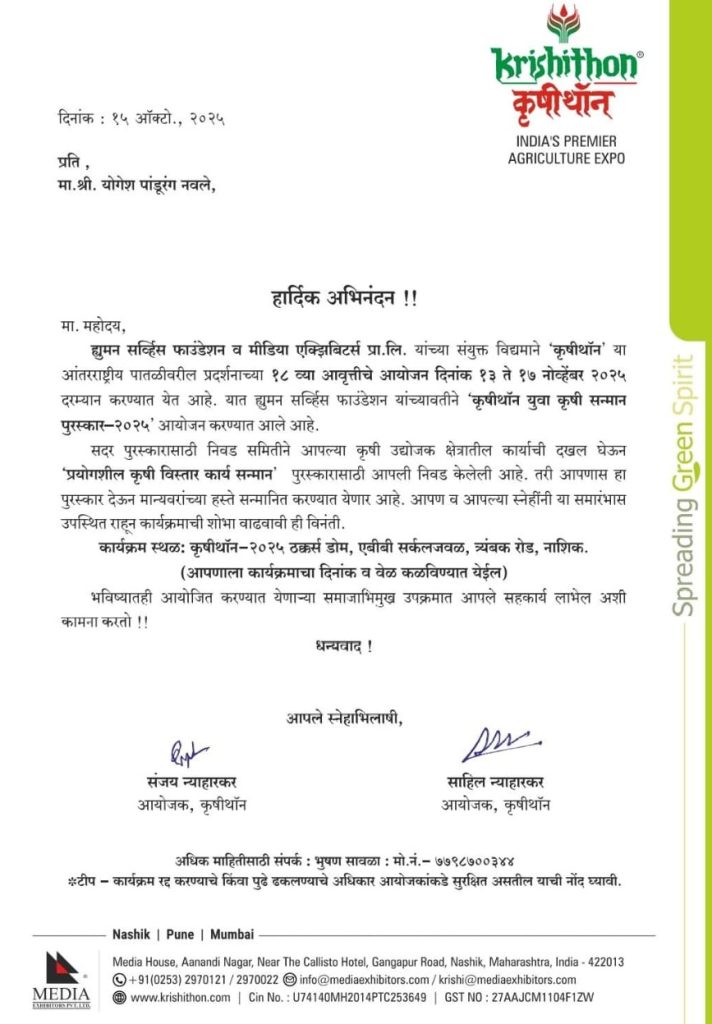 योगेश नवले यांना कृषीथॉन 2025 चा ‘प्रयोगशील कृषी विस्तार कार्य सन्मान पुरस्कार’ जाहीर