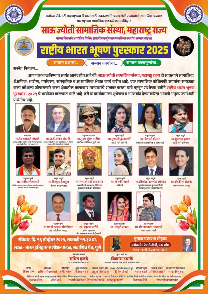 साऊ ज्योती सामाजिक फाउंडेशन व रमाई आंबेडकर संस्था यांच्या वतीने दिला जाणारा राष्ट्रीय भारत भूषण पुरस्कार जाहीर झाला आहे. पुरस्काराचे वितरण दि. १६ नोव्हेंबर रोजी पुण्याच्या भारत इतिहास संशोधन मंडळाच्या कार्यालयात होणार आहे. यावेळी विविध मान्यवरांच्या उपस्थितीत हा पुरस्कार सोहळा पार पडणार आहे
