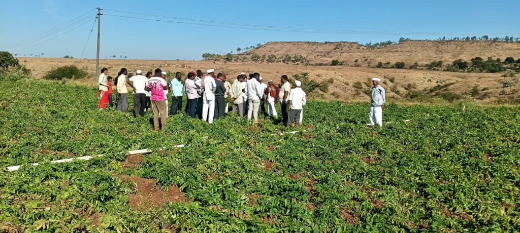मंचर परिसरातील ज्या शेतकऱ्यांकडे मोठ्या प्रमाणावर बटाटा लागवड करण्यात येते, त्यांच्या शेतांना भेट देऊन प्रत्यक्ष बटाटा प्लॉट पाहणी करण्यात आली. यावेळी बटाटा लागवड संदर्भात जमिनीची मशागत, लागवड पद्धत, खत व्यवस्थापन, पाणी नियोजन, रोग व कीड नियंत्रण याविषयी सविस्तर माहिती देण्यात आली.