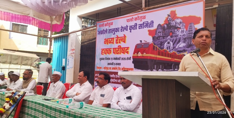 नाशिक -पुणे रेल्वे मार्ग हा अकोल्यातून गेला पाहिजे या मागणीसाठी अकोले तालुका रेल्वे कृती समिती च्या वतीने आज  शुक्रवारी  कोतूळ (ता  अकोले ) येथे भव्य एल्गार मोर्चा काढला