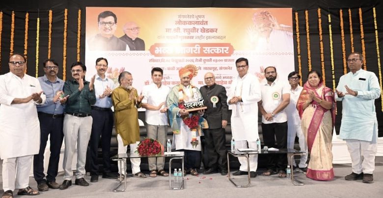 कवी अनंत फंदी खुले नाट्यगृह येथे संगमनेर मधील सर्वपक्षीय नागरिकांच्या वतीने पद्मश्री पुरस्कार मिळाल्याबद्दल लोक कलावंत रघुवीर खेडकर यांचा भव्य नागरिक सत्कार करण्यात आला यावेळी ते बोलत होते. यावेळी व्यासपीठावर ज्येष्ठ विचारवंत प्रा.डॉ.रावसाहेब कसबे, मा.आ. डॉ.सुधीर तांबे, आमदार सत्यजित तांबे, उद्योगपती राजेश मालपाणी, सौ.दुर्गाताई तांबे, डॉ. जयश्रीताई थोरात, नूर मोहम्मद शेख, प्रा.एस.झेड.देशमुख, डॉ.सोमनाथ मुटकुळे, डॉ.संजय दळवी, हिरालाल पगडाळ,नामदेव गुंजाळ यांच्यासह रघुवीर खेडकर यांचे कुटुंबीय व संगमनेर मधील विविध संस्थांचे पदाधिकारी उपस्थित होते.