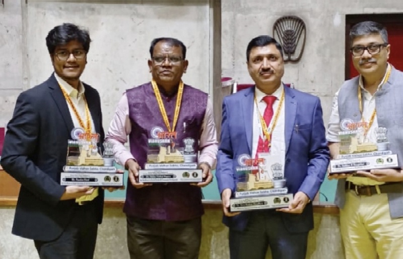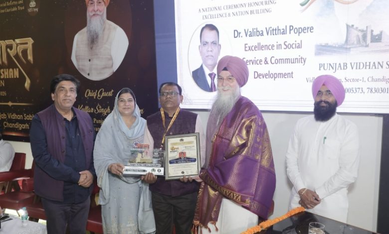 अकोले दि. ३० पंजाब विधानसभा सचिवालय चंदिगड यांच्या वतीने भारत विभूषण सन्मान 2026 पंजाब राज्य विधानसभेमध्ये मोठ्या उत्साहात पार पडला या सन्मान कार्यक्रमाला पंजाब राज्य विधानसभा अध्यक्ष ना श्री.सरदार कुलजर सिंग , व विधानसभा उपाध्यक्ष ना.श्री.सरदार जय किसान सिंग , व ना.श्री राम लोक खयना , सेक्रेटरी पंजाबी विधानसभा सचिवालय ना. श्री.सरदार सुरेंद्र सिंग मोती, सेक्रेटरी विधानसभा अध्यक्ष पंजाब राज्य श्री.अभिषेक गिलार , अधिविष्ट ज्वेलर जयपुर राजस्थान, मा. संस्थापक अध्यक्ष भारत श्री डॉ. अतुल शर्मा , मा. सेक्रेटरी श्रीमती रेणू गुप्ता मॅडम यांच्या प्रमुख उपस्थितीमध्ये तसेच महाराष्ट्र राज्यातील ठाणे जिल्ह्यातील बदलापूर येथील आदिवासी सेवक तथा भारत नेपाळ मैत्री फोरम भारत देश उपाध्यक्ष नवी दिल्ली डॉ. व्ही.व्ही.पोपेरे यांना राष्ट्रीय स्तरावर उल्लेखनीय समाजकार्याची दखल घेऊन पंजाब राज्या विधिमंडळ सचिवालय यांच्यावतीने पंजाब राज्य विधिमंडळ अध्यक्ष यांच्या हस्ते भारत विभूषण सन्मान 2026 पंजाब राज्य विधिमंडळामध्ये प्रदान करण्यात आला.